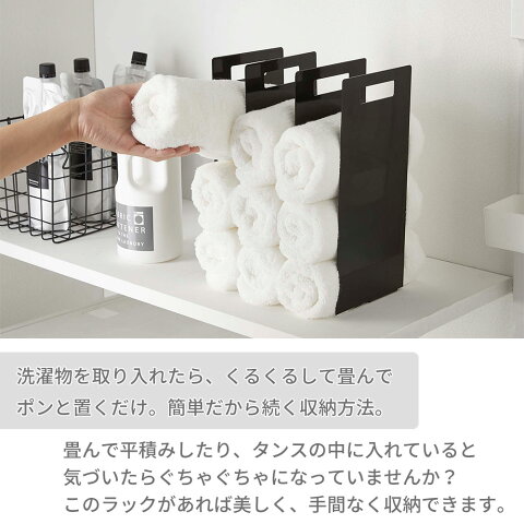 バスタオルからフェイスタオルまで対応のタオルラック 組み合わせ次第でバスタオルのサイズやフェイスタオルのサイズに変化! 洗濯物を取り入れたら軽く畳んでくるくるして収めるだけ!スッキリとした見た目で使いやすさも抜群! 細部のディティールにもこだわり、上部が持ち手になっているのでちょっとした移動も簡単!連結しているので2列同時に持ち上げることができます。