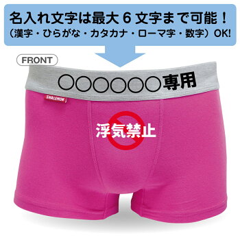 浮気が心配な、旦那にプレゼントしましょう! これを穿いて浮気はなかなかできるもんじゃない(笑) 愛するからこそ、浮気を未然に防ぐプレセントを! ただ・・・これを笑顔で渡されたら、ちょっと対応に困るかも(笑) 文字は6文字まで黒色でプリントします。